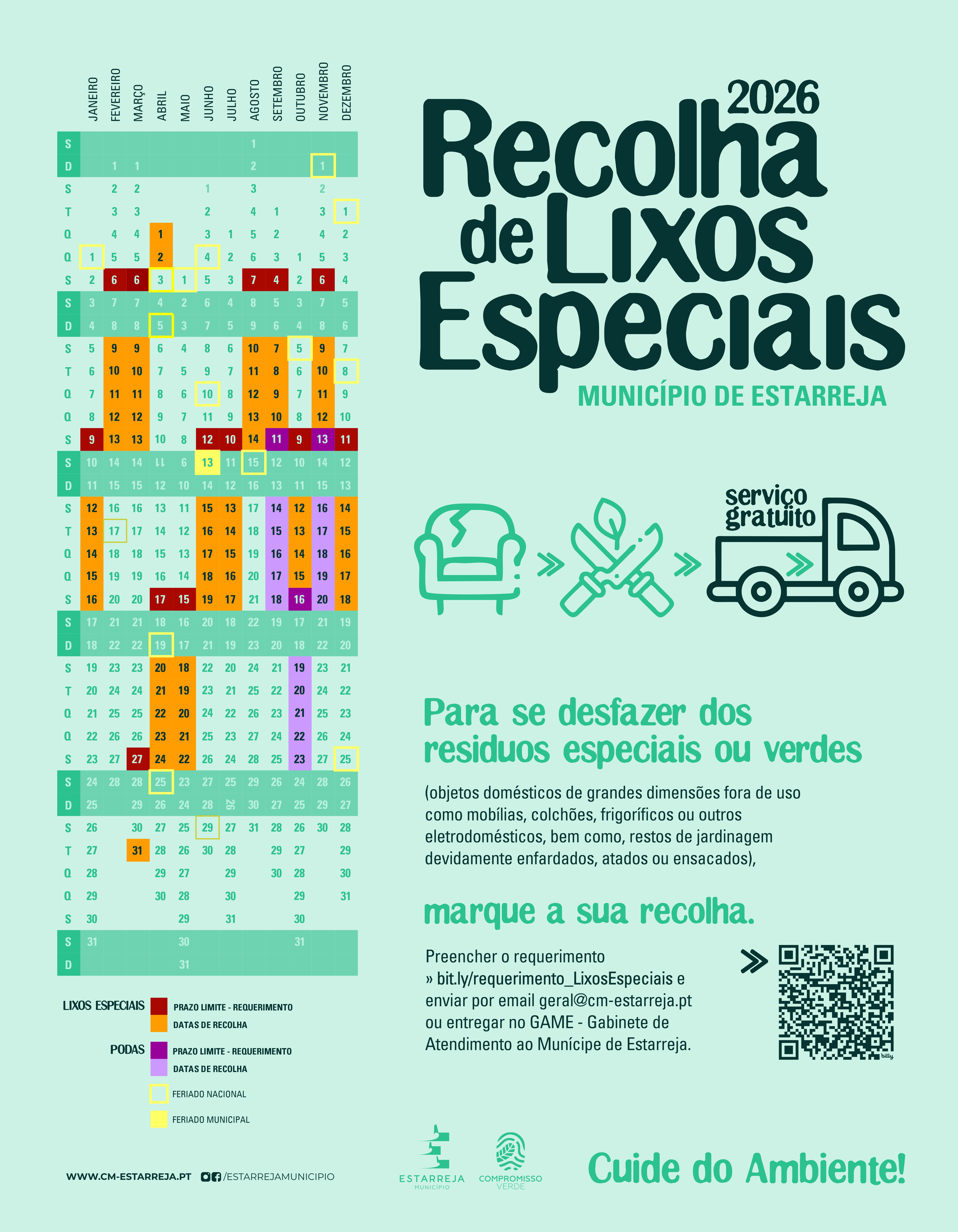 A Câmara Municipal de Estarreja relembra que os munícipes podem requerer, até dia 6, o serviço gratuito de recolha de lixos especiais (monos) e resíduos verdes, tal como consta no calendário anual, divulgado no início deste ano.